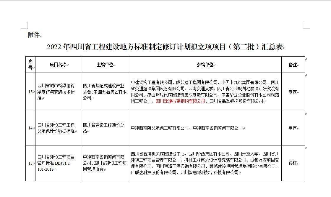 “行業(yè)標(biāo)準(zhǔn)為旗桿,科研技術(shù)為導(dǎo)向”,2022年8月22日,四川綠建杭蕭鋼構(gòu)有限公司(以下簡稱:綠建杭蕭)參編的《四川省城市橋梁鋼箱梁制作與安裝技術(shù)標(biāo)準(zhǔn)》在四川省住建廳官網(wǎng)進(jìn)行公示。這是繼“中國鋼結(jié)構(gòu)協(xié)會”會員單位、第二批天府綜改企業(yè)之后,同年再次獲得的殊榮。綠建杭蕭在行業(yè)領(lǐng)域標(biāo)準(zhǔn)中發(fā)出了自己的聲音!